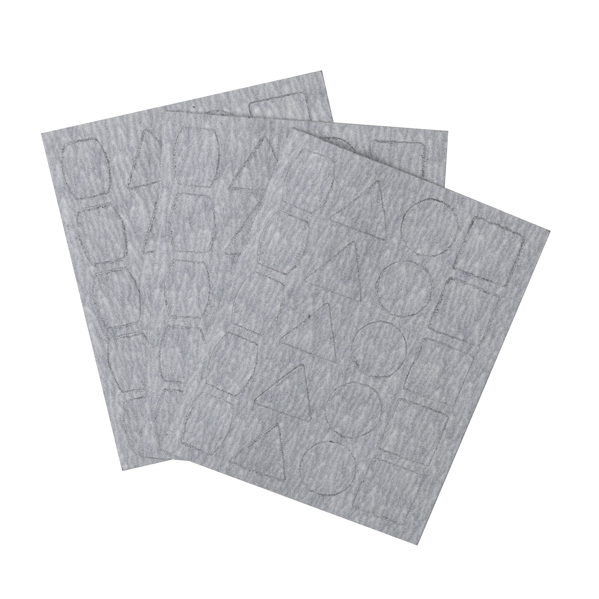 • Kolme tarra-arkkia, joissa 20 erimuotoista hiomapaperia