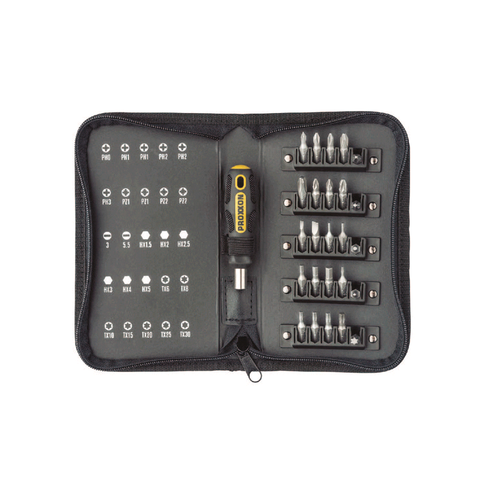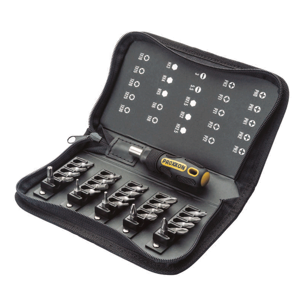 Kompakti bittisarja Mini FLEX-DOT -kahvalla. Toimitetaan toiminnallisessa vetoketjullisessa kotelossa. Sisältää 25 yleisintä bittimuotoa käytännöllisessä taitettavassa pidikkeessä, joka helpottaa bitien käyttöä. Mukana Mini-FLEX-DOT -kahva magneettipidikkeellä. Kaikissa biteissä pysyvästi selkeät merkinnät.